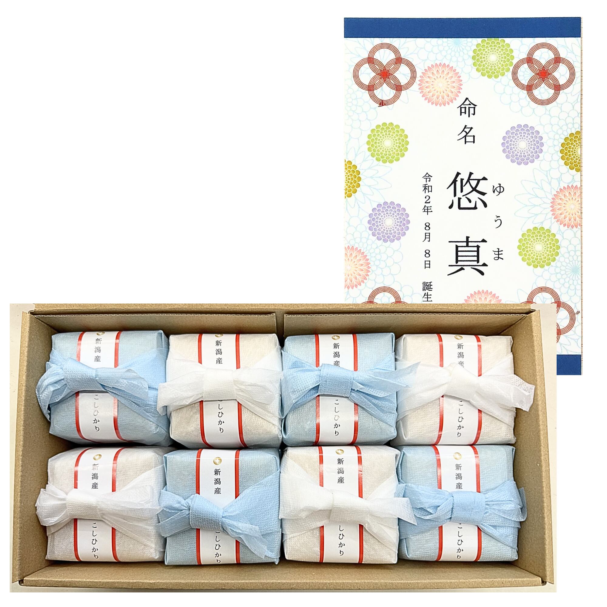 出産祝いにお使いいただける五ツ星マイスターが厳選した新潟県産コシヒカリのお名入れギフト。